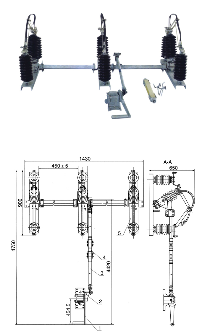 中性点隔离开关主要由隔离开关,主体连杆系统,操作机构组成。本体有触头装配,棒式支柱绝缘子,导电杆装配,安装板等装配组成。连杆系统由接头和连杆组成。操动机构输出轴可作120°水平旋转,通过连杆系统及拐臂转动动触头与静触头合闸或分闸。处于合闸或分闸位置时,由操作机构上的定位装置保证动触头与静触头处于正确的合闸位置或分闸位置。 |